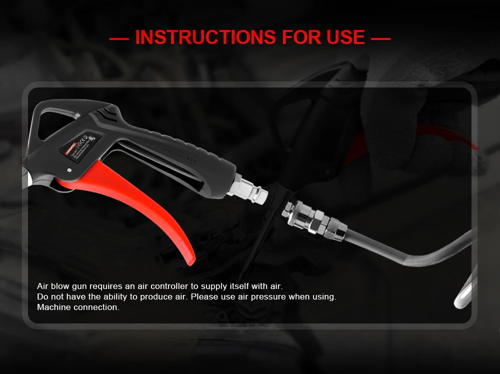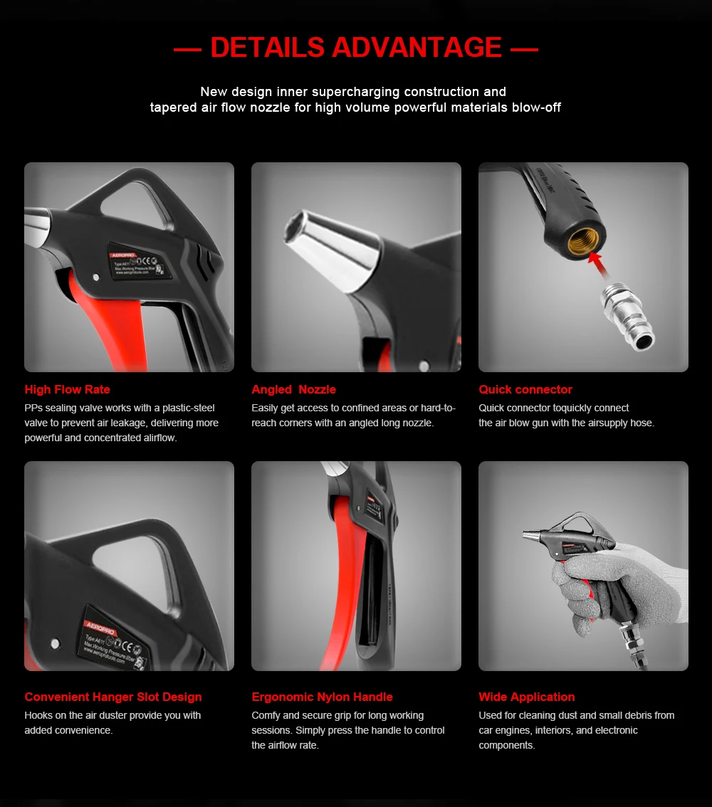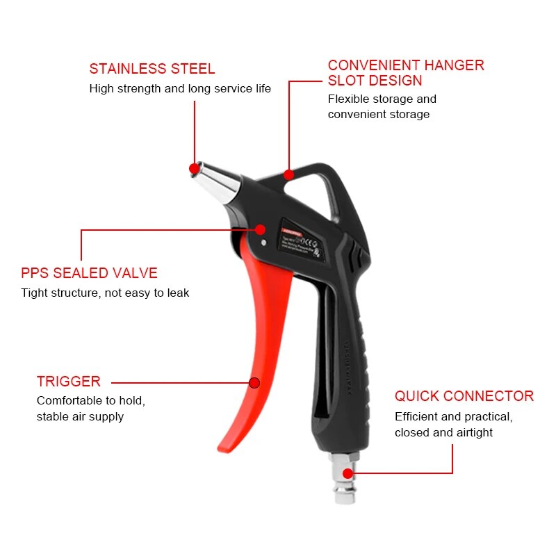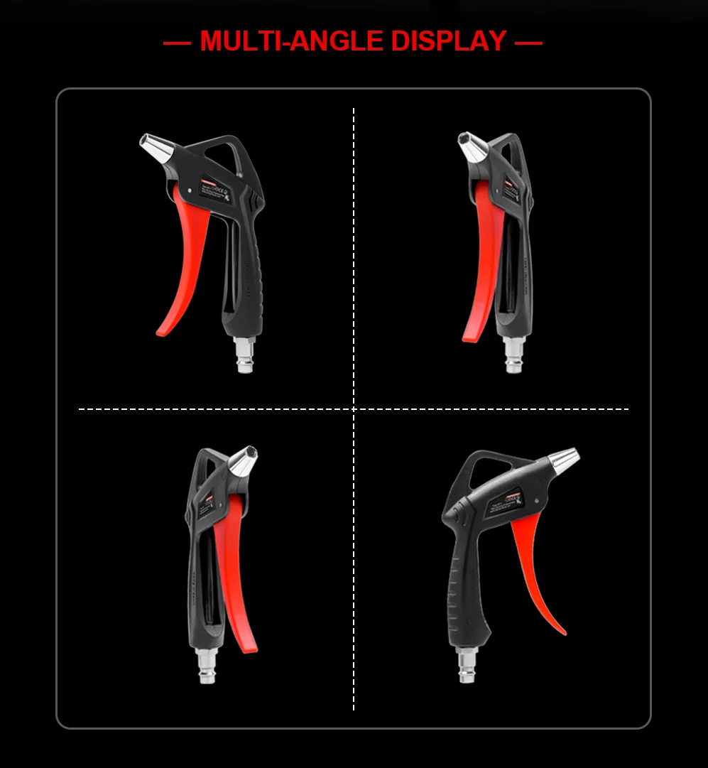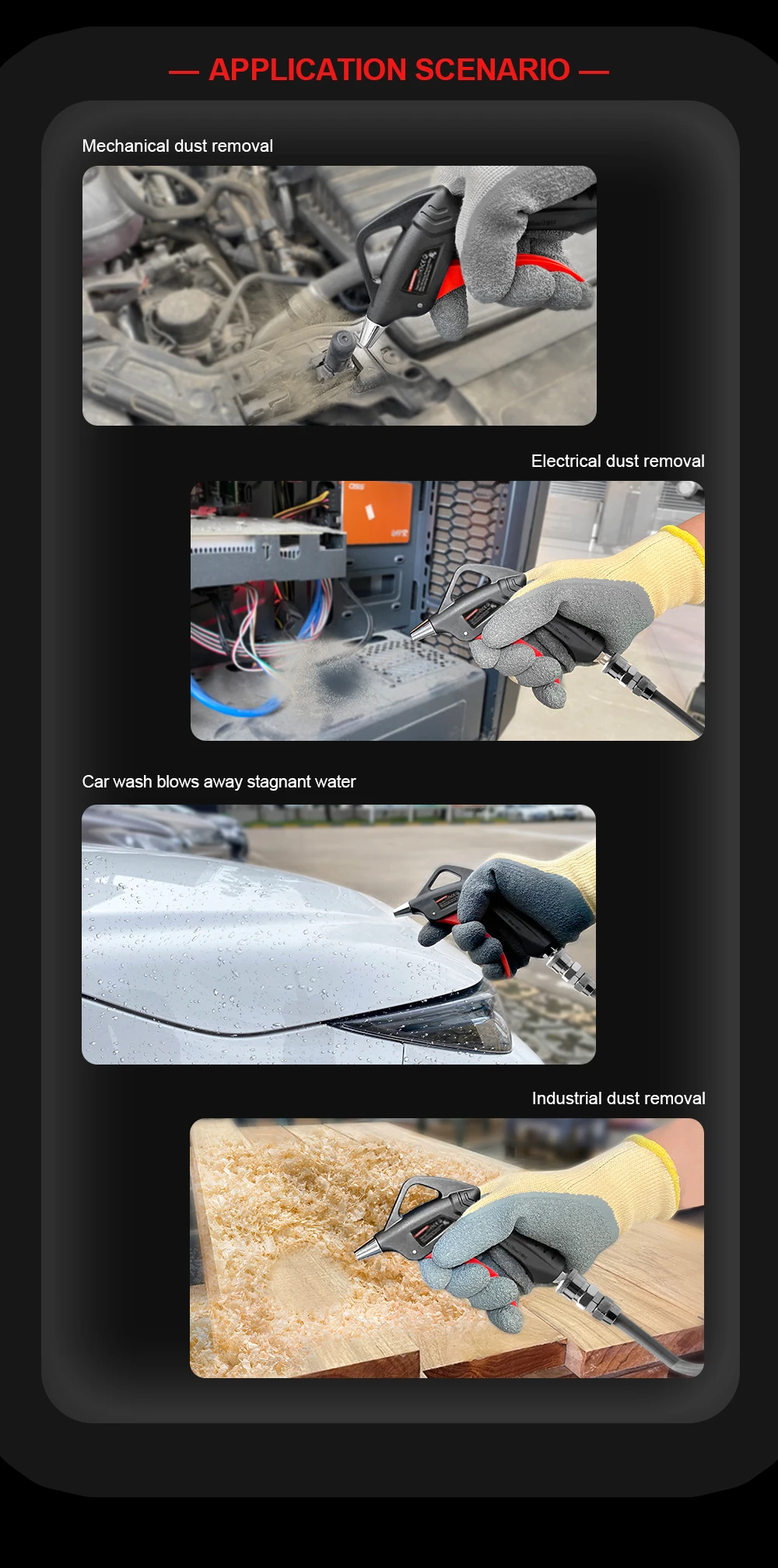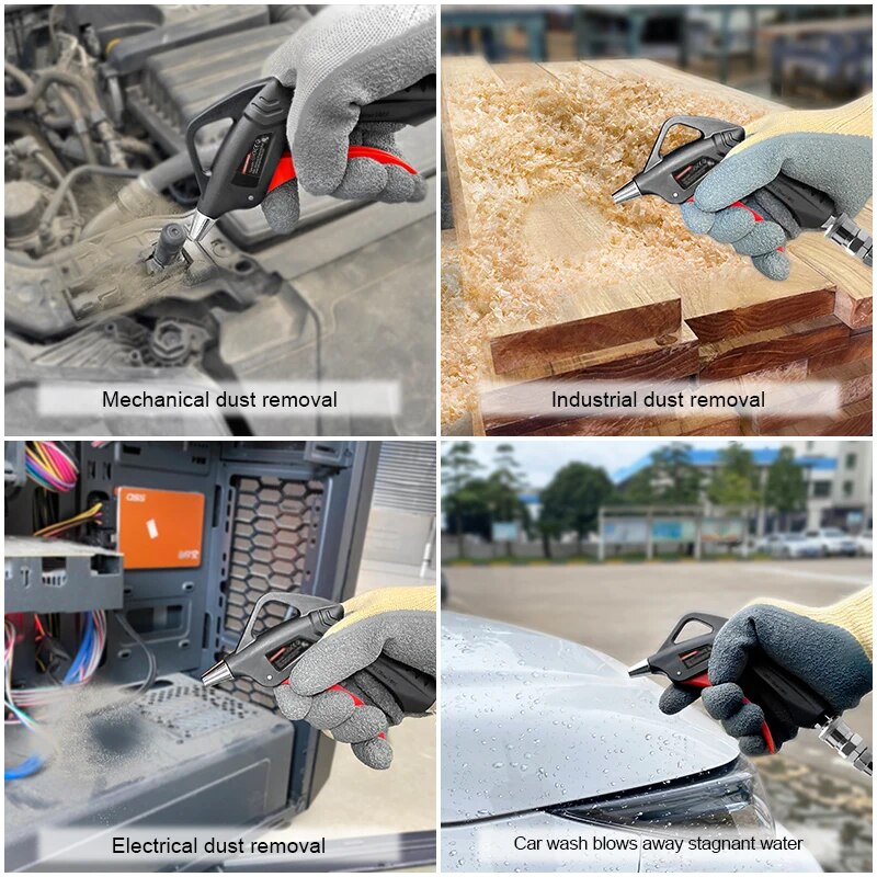 This air blow gun have a wide range of application scenarios,best used for dusting and drying wet paint, blow dust and dirt from fragile molds, coated surfaces, inside pipes,blowing dust, water drops, powder, debris and various industrial or household cleanup and blow-off operations, etc.