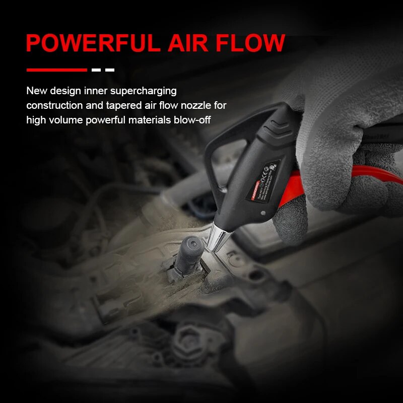 Powerful air flow, new design inner supercharging construction and tapered air flow nozzle for high volume powerful blow-off.