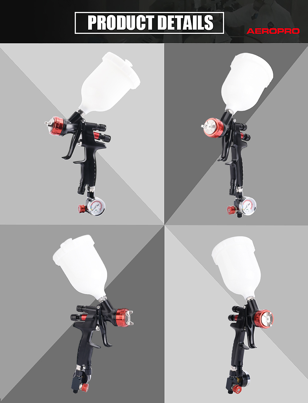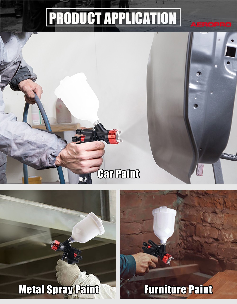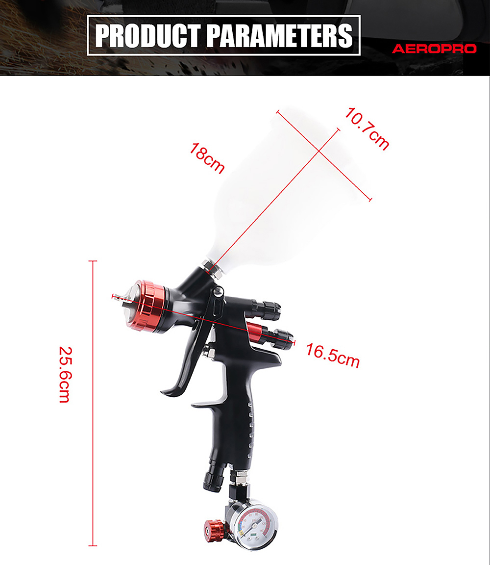 • Exact adjustment:Desired pattern, fluid output volume, and fine atomization can be easily achieved by adjusting the pattern, fluid, and air control knobs.