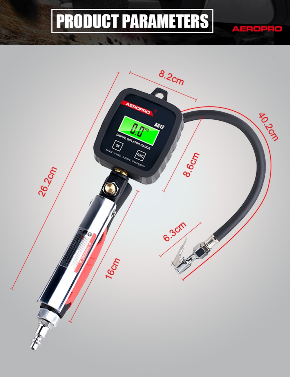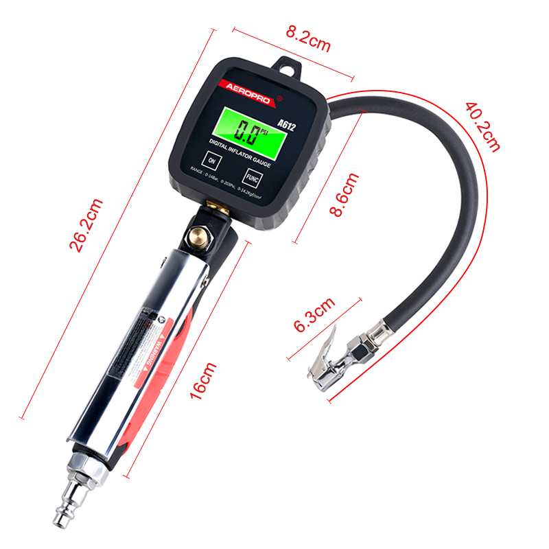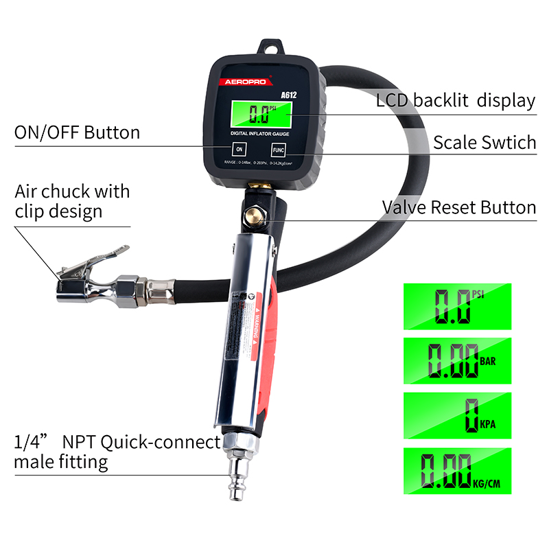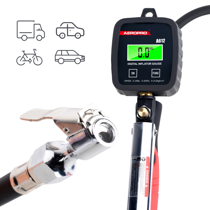 The Aeropro A612 Digital Tire Inflator Gauge makes filling tires extremely easy when using an air compressor. Instead of filling a tire, check the pressure, adjusting, checking, and repeating over and over again, simply fill the tire to the exact pressure you want. Fill a tire to specification twice as quickly or even faster by using fewer instruments! Save time and just fill it right the first time.